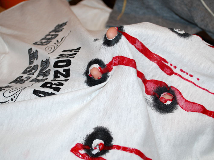 撃たれて血が出ています。